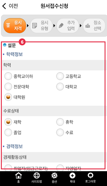 학력 , 수료상태 , 경제활동상태, 응시목적, 시험준비경로, 시험준비기간을 빠르게 체크해서 다음 누르기